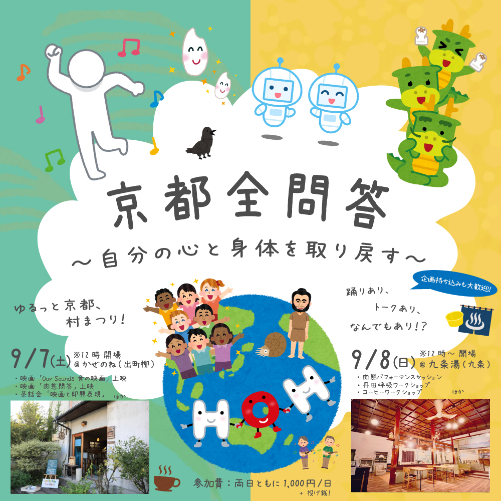 - 今度は京都で!9/7〜 “全” 問答!もはや業種も主催も関係なし!?京都の魅力的な会場2箇所と連日にわたり問答?お祭り?即興セッション?何が起こるかわかりません! 上映はありますよ♪